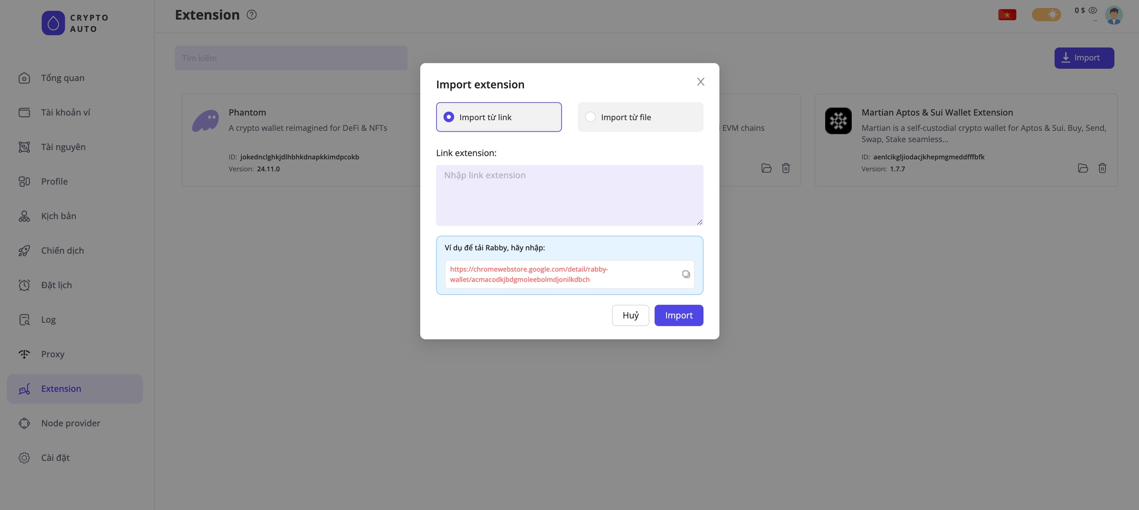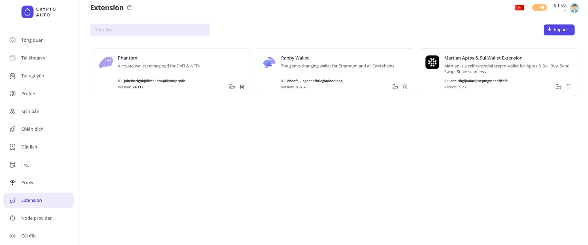 This feature allows you to install and manage extensions for browser profiles. For example, after you install wallet extensions like Phantom, Rabby, or Martian in the Extension Management section, every browser profile created by CryptoAuto will automatically include the Phantom, Rabby, and Martian extensions.