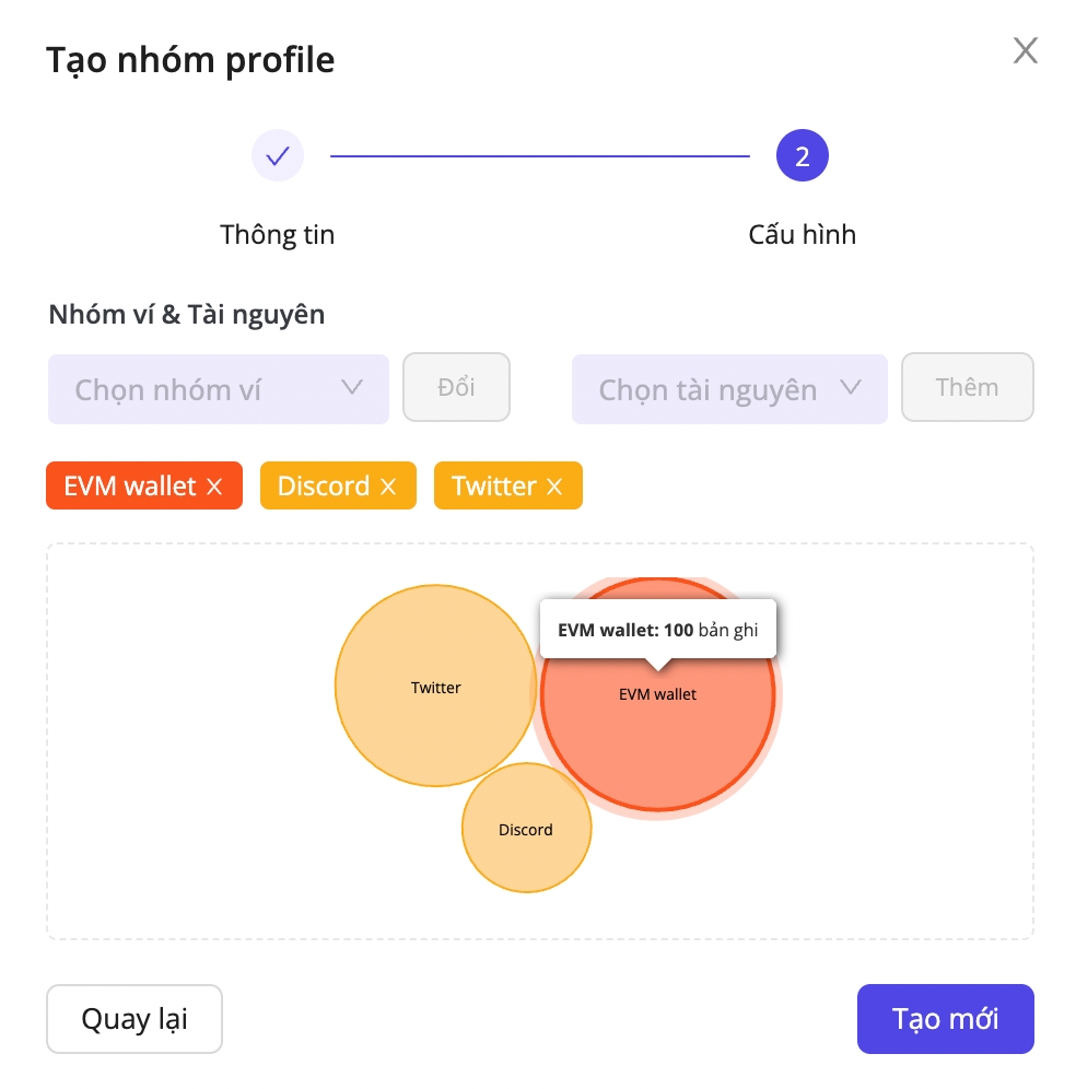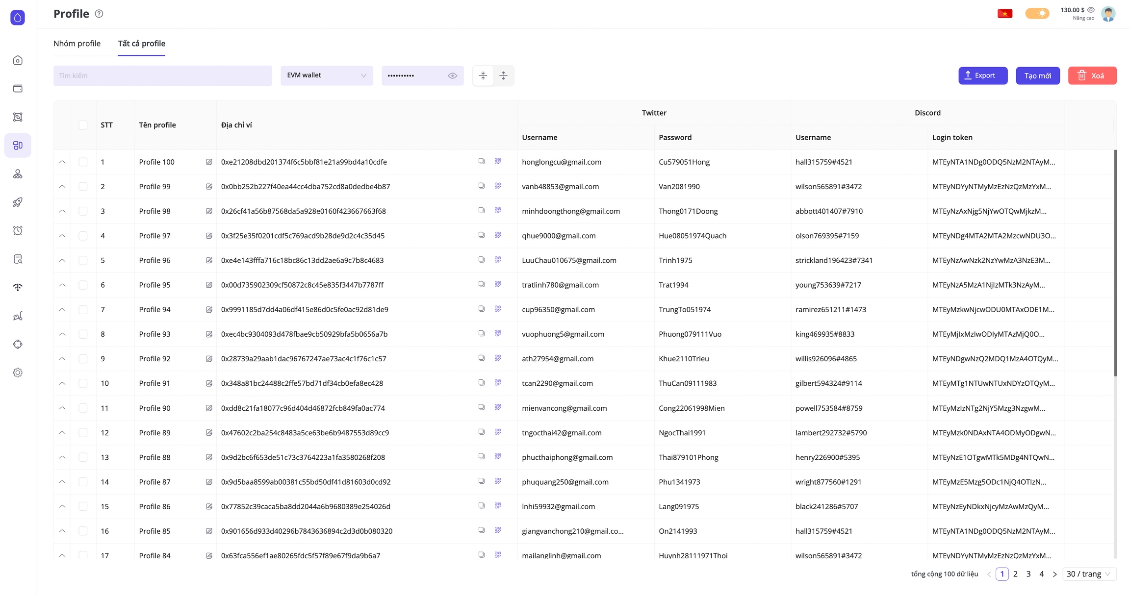 the software will automatically generate 100 profiles (the number of profiles will match the largest set among wallets and resources). If there are more wallets than resources, a single resource will be paired with multiple wallets. For example, in the scenario above, one Discord account will be paired with five different wallets, and one Twitter resource will be paired with two different wallets.