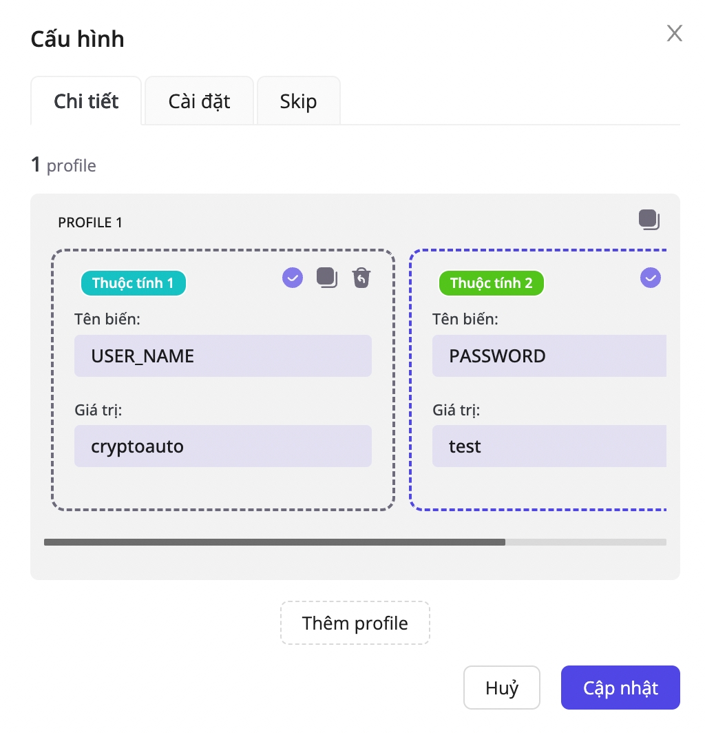 A profile bundles multiple attributes, each mapped to a specific variable, so a single profile can hold many (Variable name, Value) pairs.