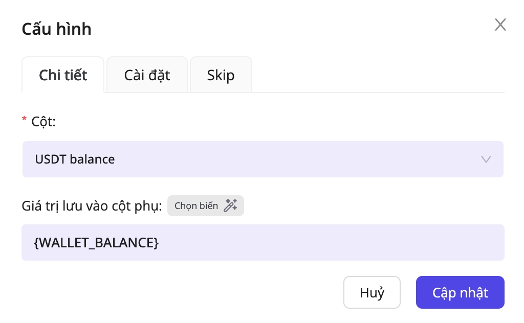 In a workflow that retrieves each wallet’s USDT balance, run the Update profile processor right after the Get balance processor to store the