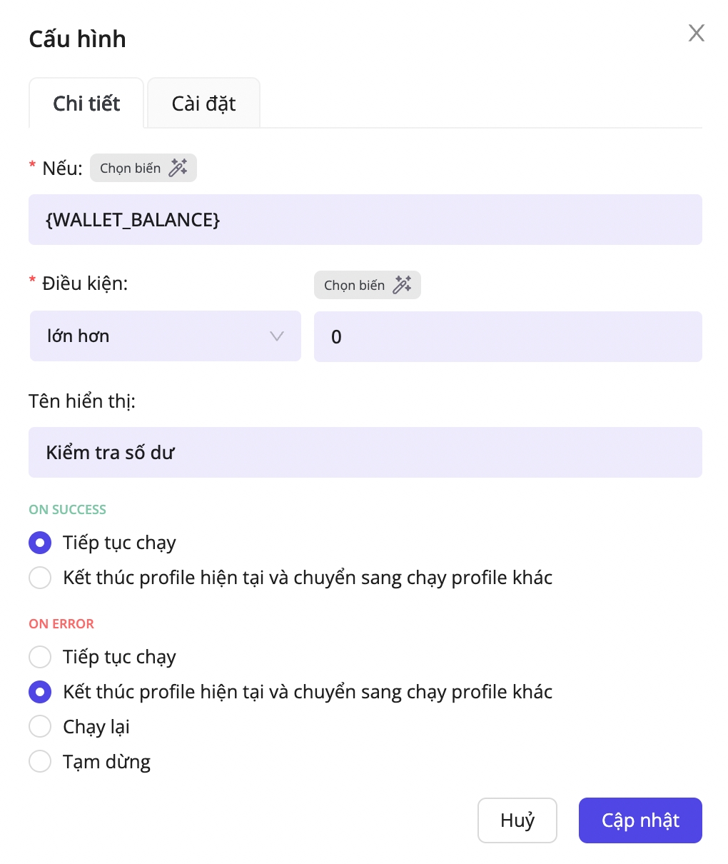 In the Uniswap swap scenario, if the wallet’s WALLET_BALANCE (token balance) is greater than 0, that profile continues running; if the balance equal to 0, the flow ends and shifts to another profile, skipping the Swap Uniswap processor entirely.
