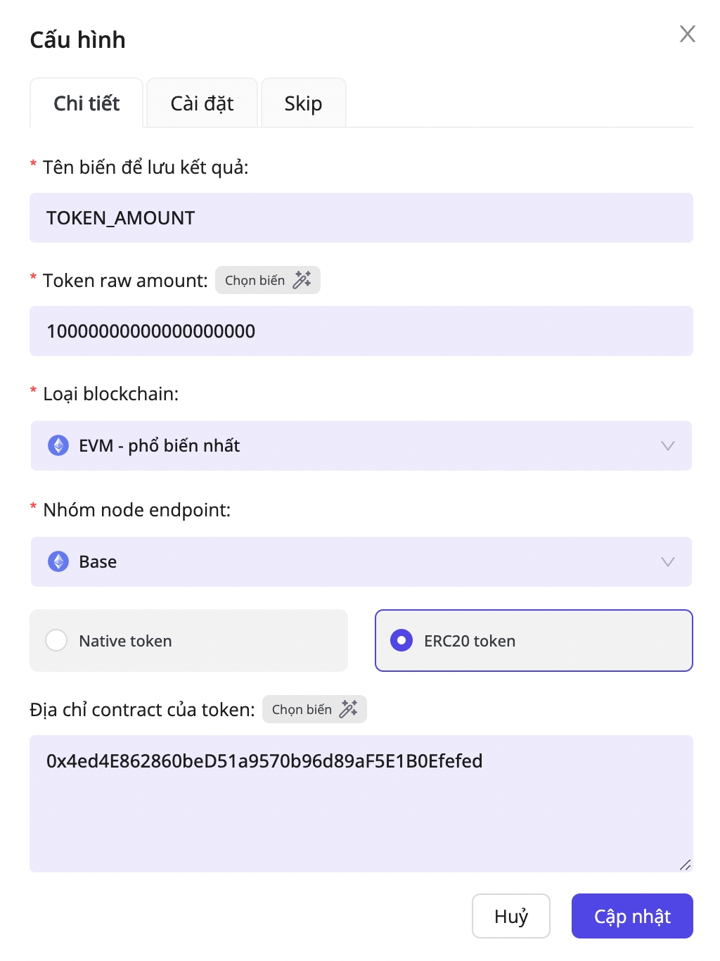Địa chỉ token, nếu bạn chọn Native token thì có thể bỏ qua trường này