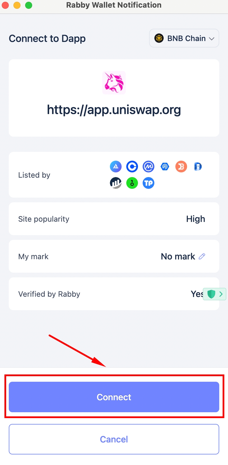 In certain cases, such as unfamiliar dApps or wallet sites you haven’t whitelisted Rabby may display a warning. To complete the connection successfully, enable Skip warnings and choose "Ignore all".