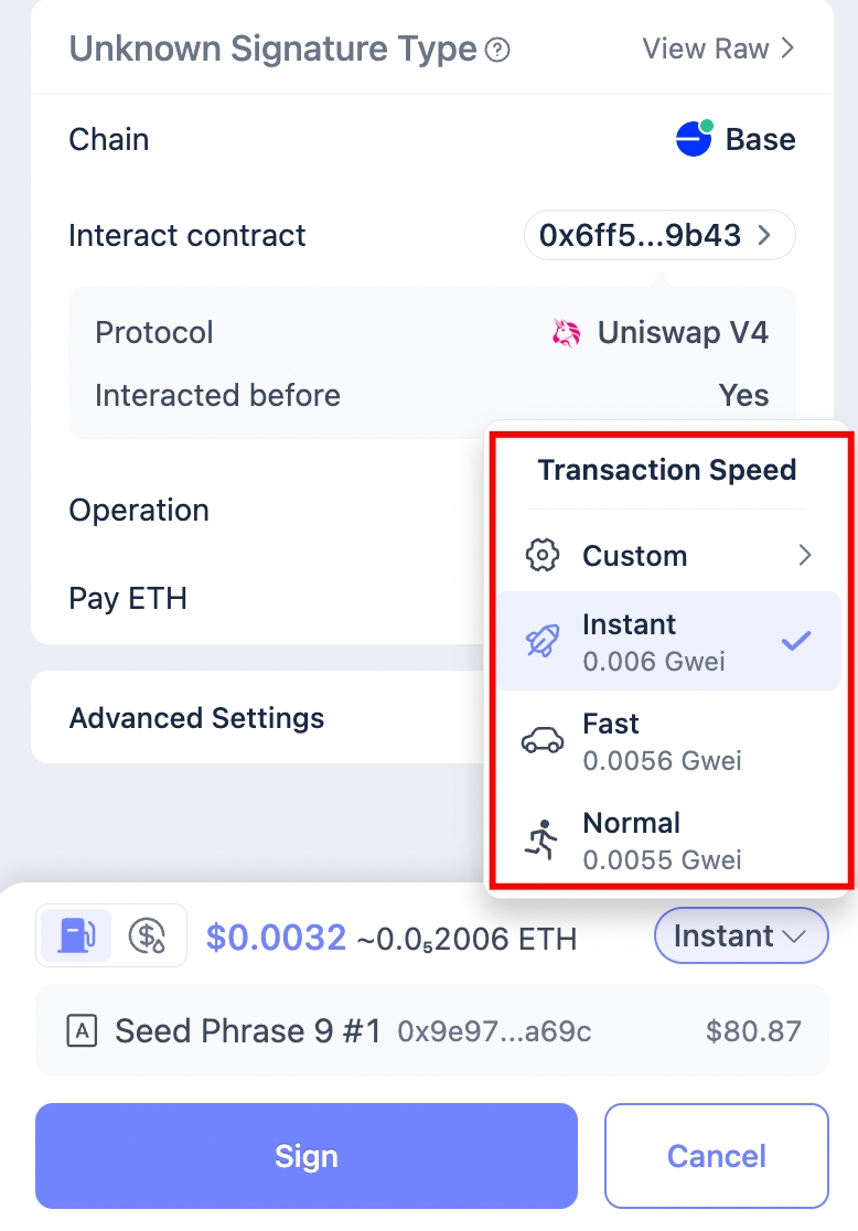 If you select the Custom gas mode, the processor opens the popup, applies your configured gas price, and clicks Confirm then proceeds with Sign and Create: