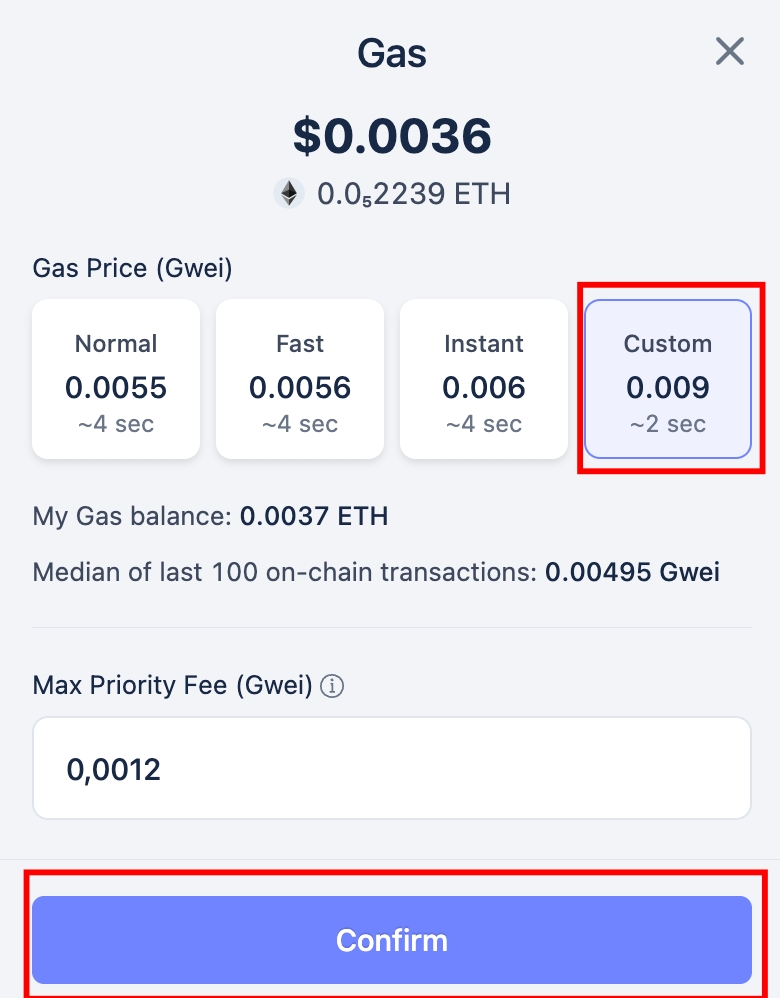 To customize the transaction’s gas price, enable Customize gas price? . You can then choose among four modes: Normal, Fast, Instant, or Custom: