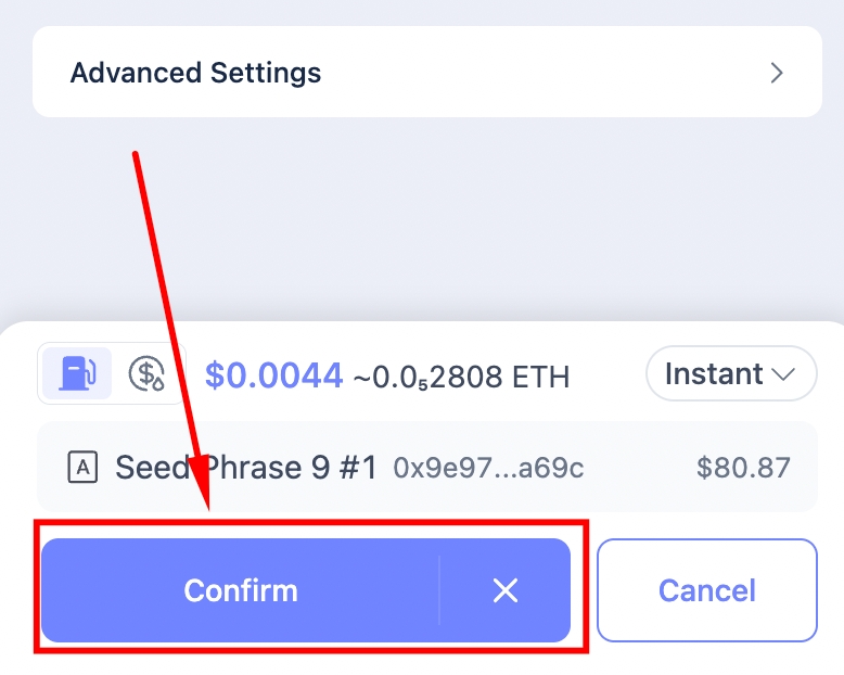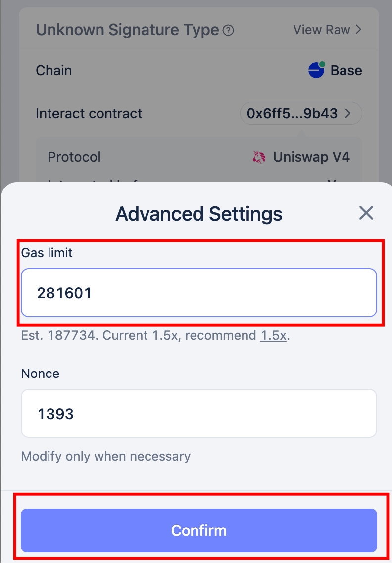 When the Advanced Settings popup appears, the processor applies your gas-limit settings, then clicks Confirm.