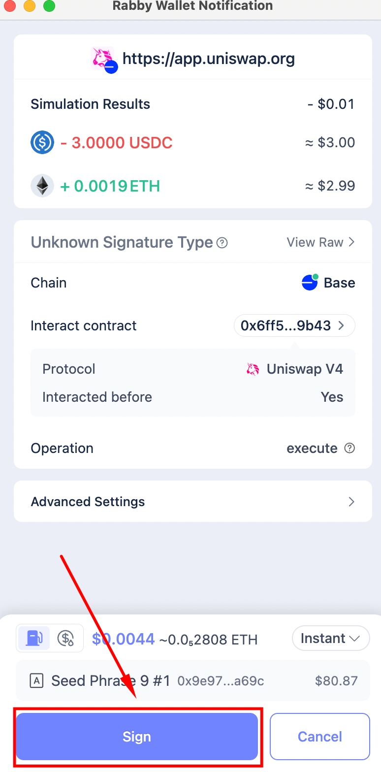 Sign in Rabby walletAfter Sign is clicked, the Create button appears and the processor clicks it automatically.