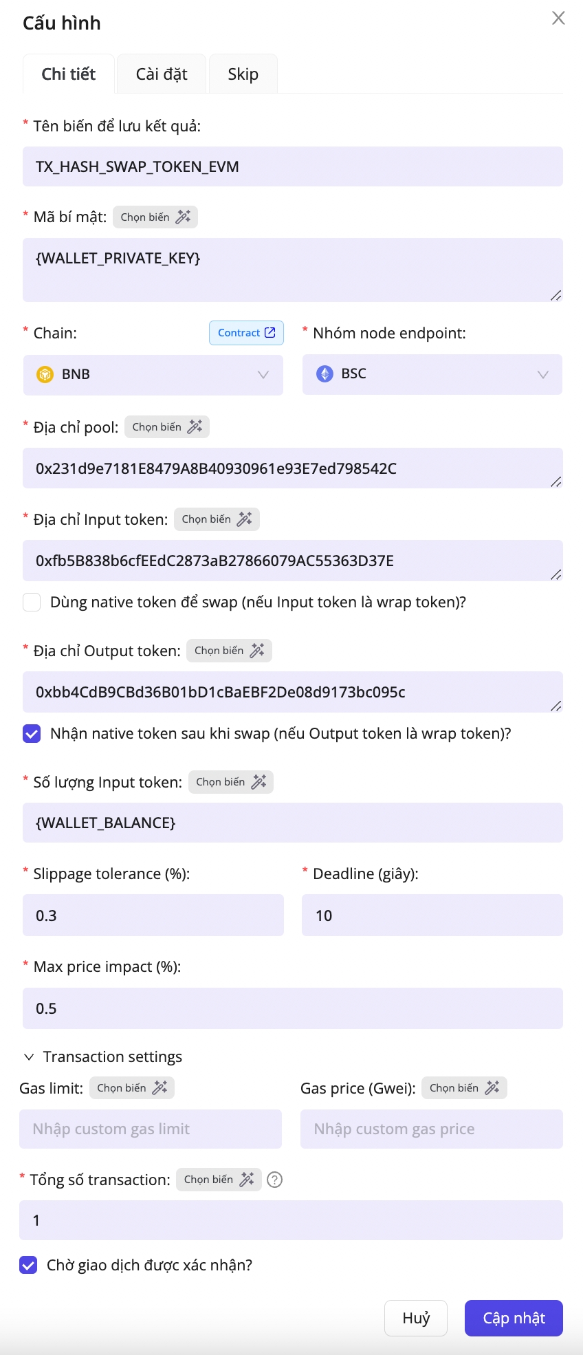 In the example above, the configuration swaps FLOKI tokens to BNB using the FLOKI/WBNB pool on the BNB network.