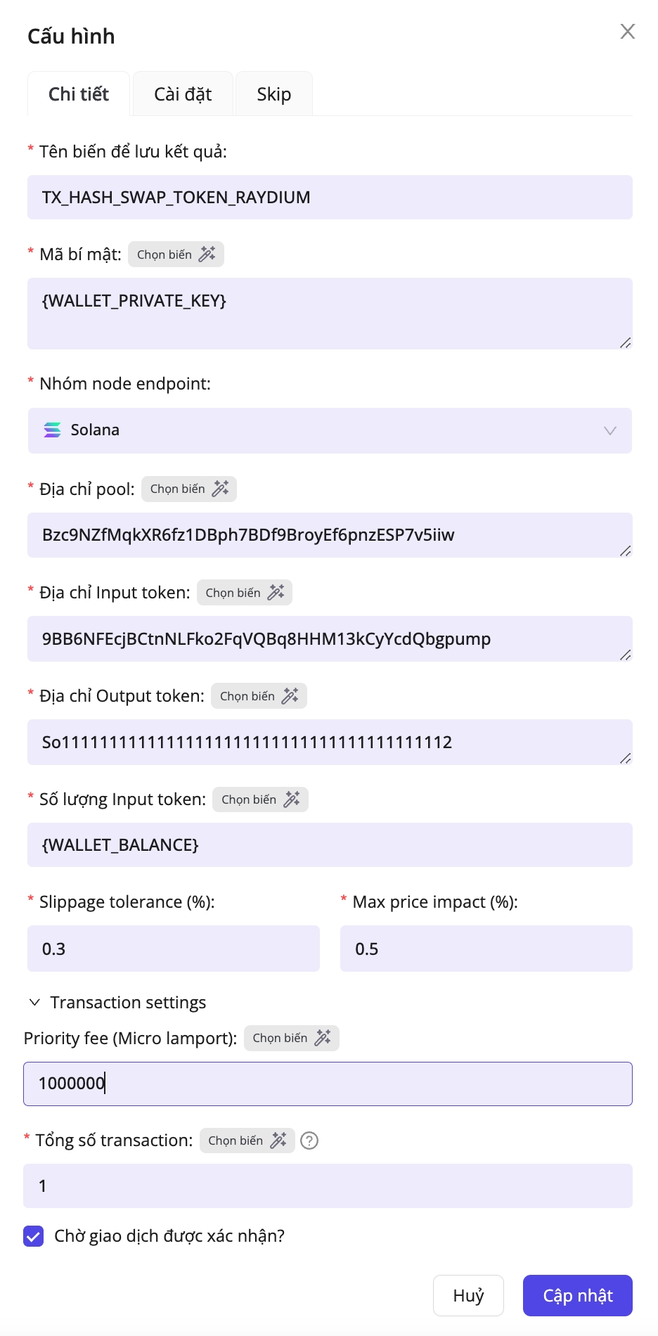 In the example above, the configuration swaps FARTCOIN tokens to SOL using the FARTCOIN/SOL pool on the Solana network.